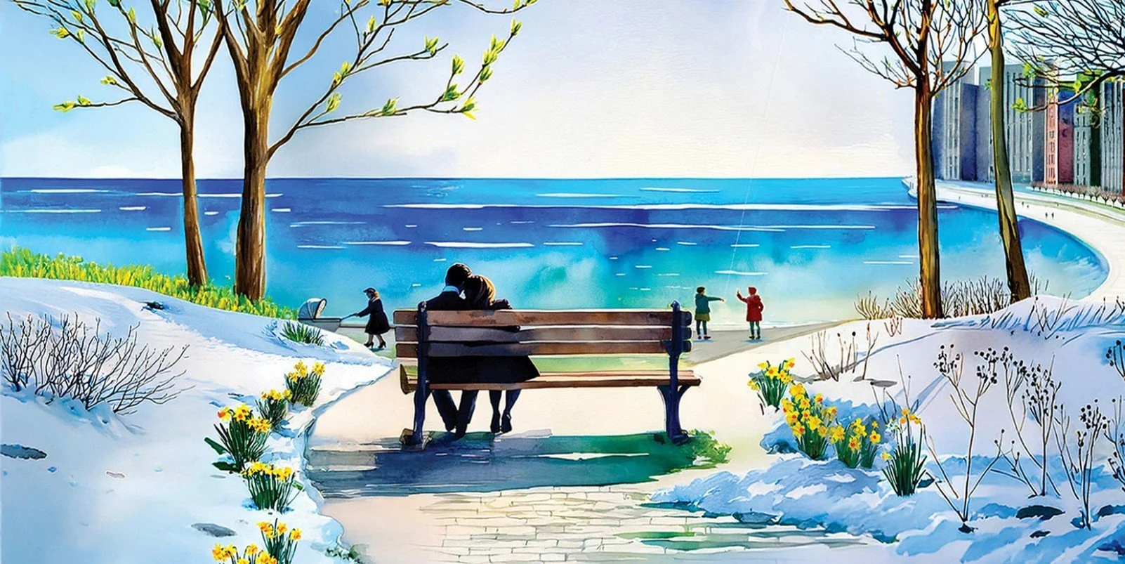 The watercolor was just abstract enough to convey life and vibrancy, and its balance, proportions, and perspective were exquisite. It showed the view from the Oak Street beach, looking east across Lake Shore Drive and out to Lake Michigan. The centerpiece was the calming lake itself. The sun had risen, so a new day had begun. Around the bases of the trees, yellow daffodils had popped out through the snow. A child’s yellow kite with a whimsical rag tail danced in an early spring breeze, a symbol of hope she was sure Bob intended. Aside from the strollers on the beach, the only figures recognizable as people were a silhouetted man and woman seen from the back. They sat on a park bench, their heads leaning together as they gazed at the jeweled shimmer that connected them to the far horizon where sky and water met. To Rachel, the scene suggested the two were talking about the possibilities in their future together, as limitless as the expanse before them.